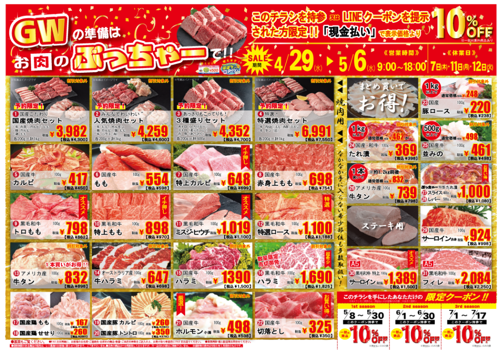 チラシまたはLINEクーポンをお見せ頂くと現金支払いで対象商品が10%OFFになりますよー!
