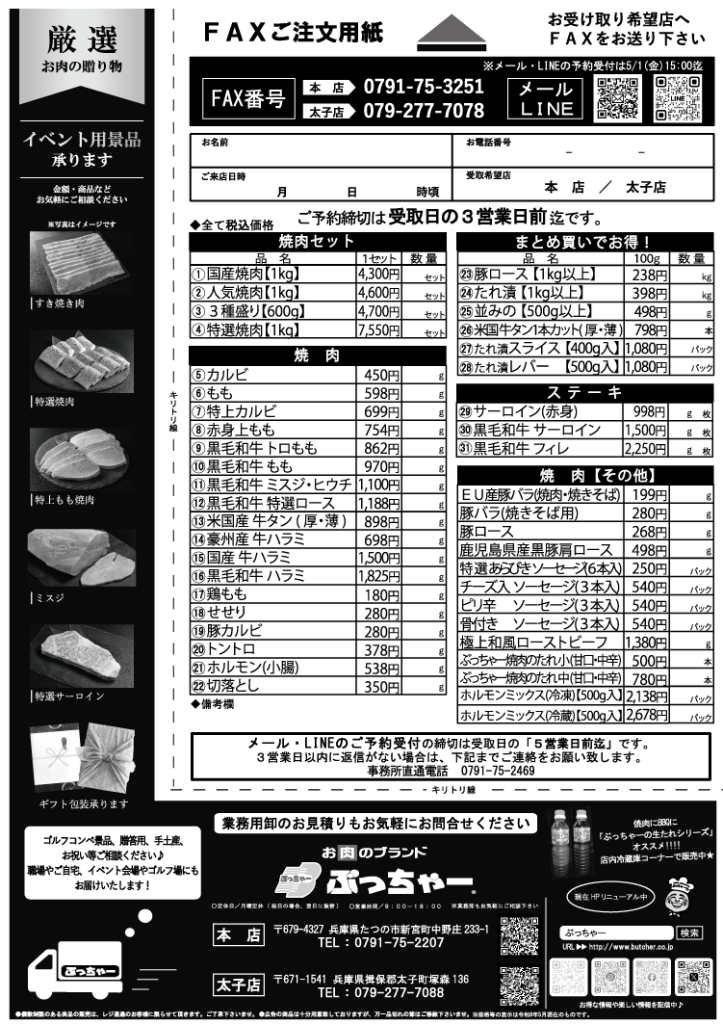 電話、FAX、ご来店でのご注文のご予約は3営業日前迄にお願いいたします